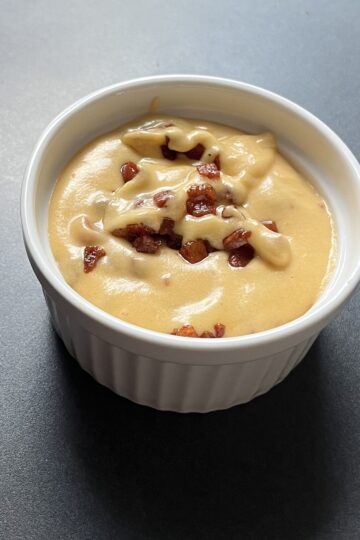 Schön cremig, ordentlich Cheddar, ein bisschen Würze durch Worcestersauce und oben drauf Bacon, der knuspert und alles noch besser macht. Perfekt zu Nachos, Brot, Pommes, Gemüsesticks oder einfach… Löffel.