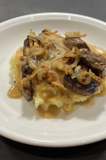 Wenn du Lust auf so richtiges Comfort Food hast, ist das hier ein Volltreffer: saftige Steak-Würfel mit Röstaromen, cremiges Püree und eine kräftige Sauce, die alles zusammenhält. Dazu kommen karamellisierte Zwiebeln und fertig ist das Teller-glücklich-Essen.