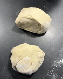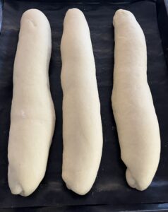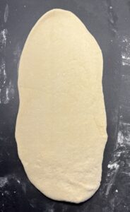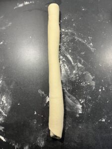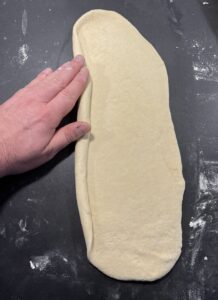2. Teig raus, kurz durchkneten und erst mal zu einer länglichen dicken “Wurst” formen, damit du ihn easy in 3 gleich große Stücke teilen kannst. Je genauer du hier bist, desto gleicher sehen die Subs später aus (und wenn nicht: schmecken trotzdem genial).