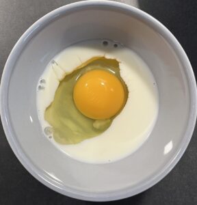 1. Ei + Milch verquirlen und stehen lassen (beides darf Raumtemperatur bekommen, damit dir das Brot später nicht zusammenfällt).