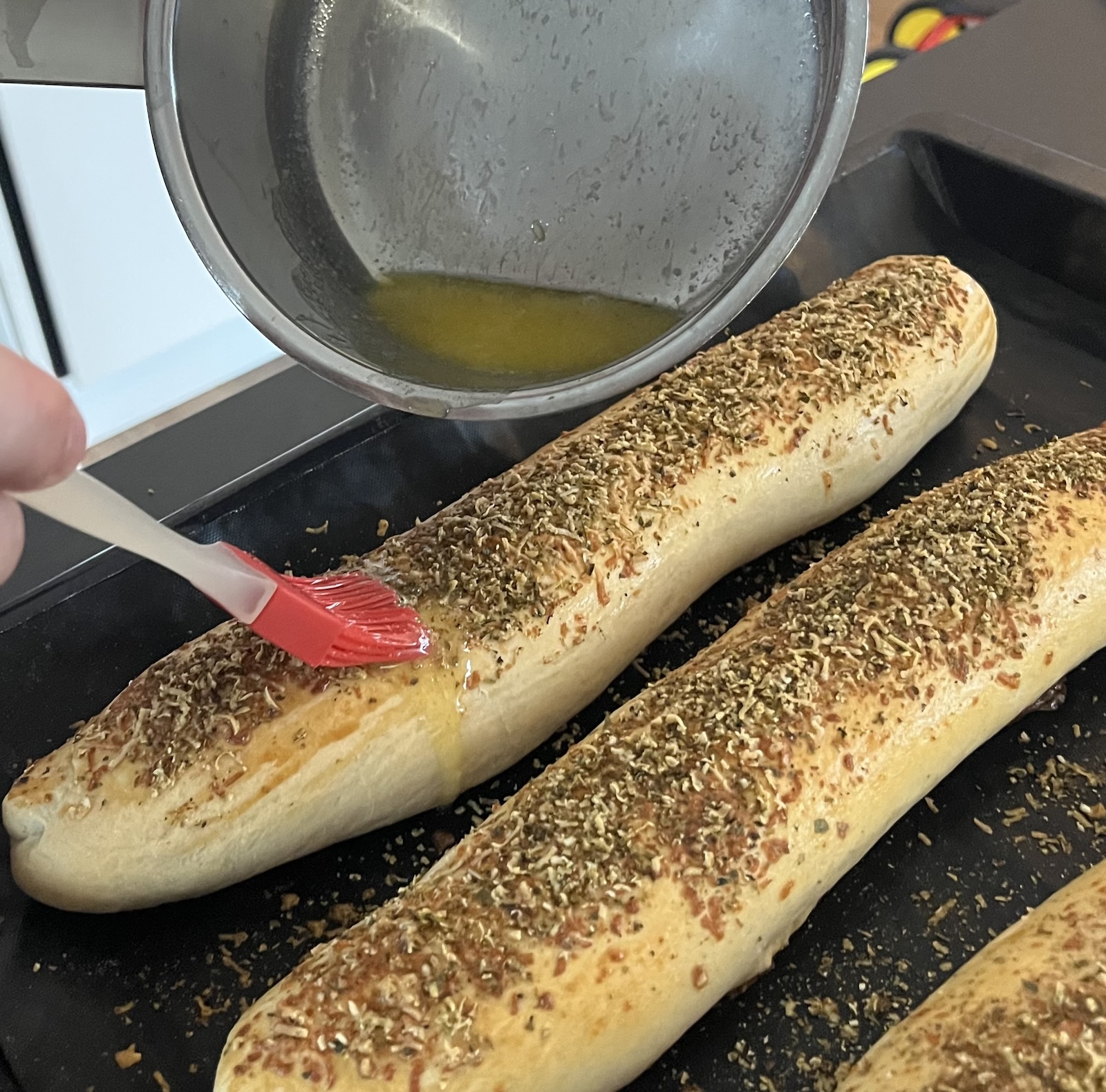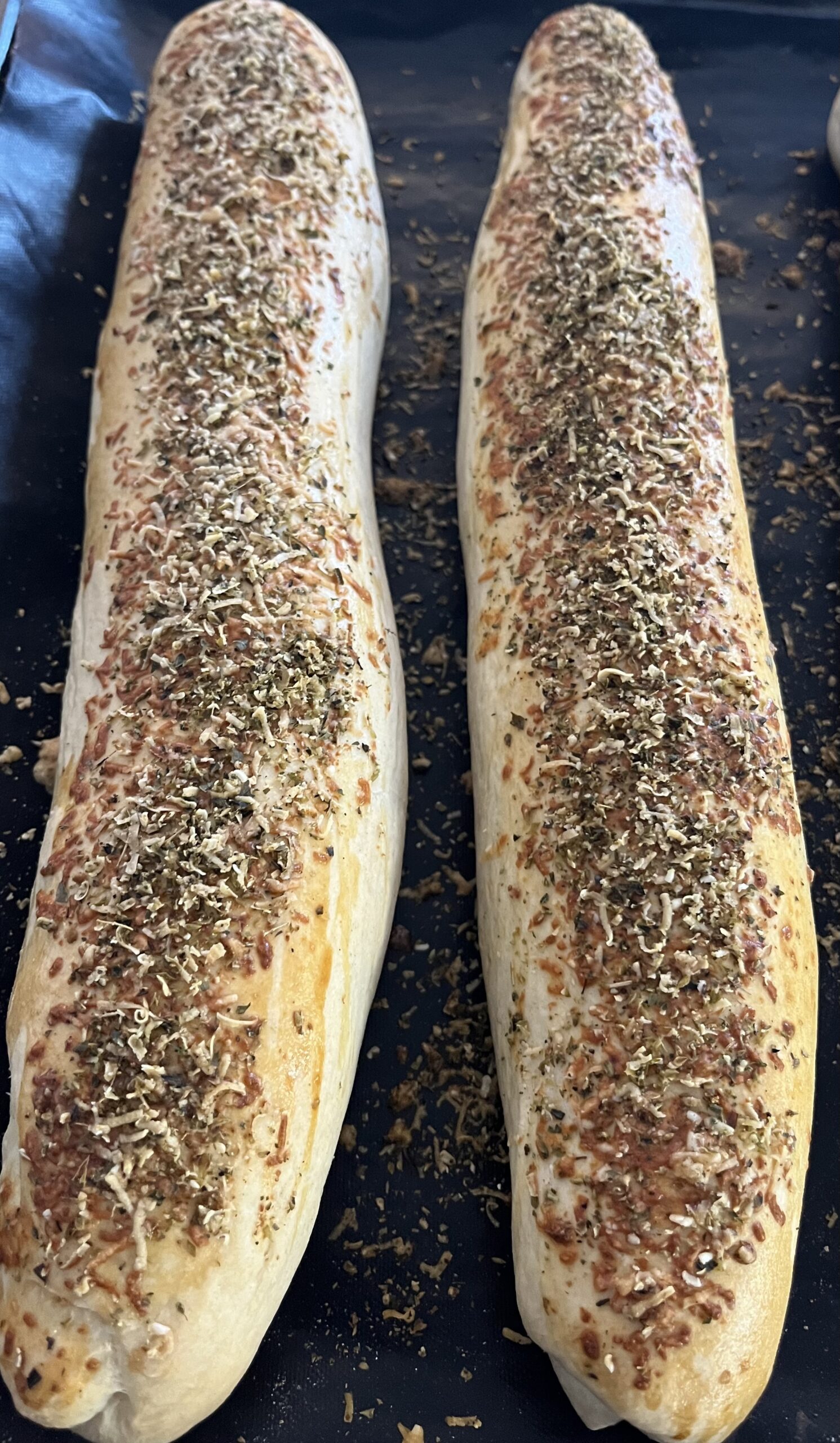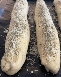 1. Nach der Stunde sind die Baguettes nochmal schön aufgegangen. Jetzt mit der Ei-Milch-Mischung bestreichen und die Parmesan-Oregano-Mischung drüber streuen.