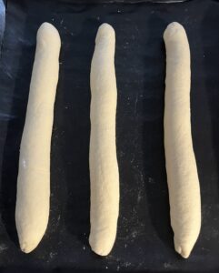 4. Dann von links nach rechts aufrollen, damit ein Baguette entsteht. Die Enden gut zusammendrücken und mit der Naht nach unten auf ein mit Backpapier ausgelegtes Backblech legen.