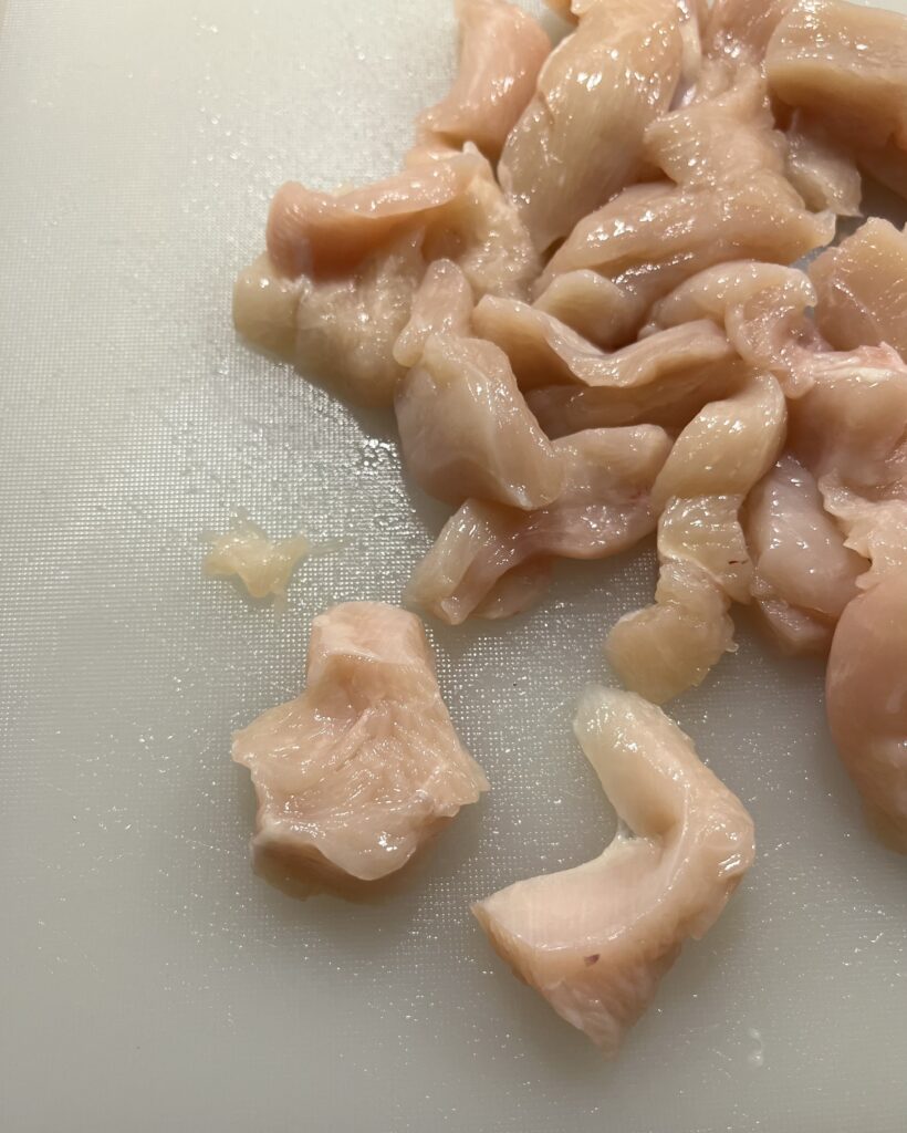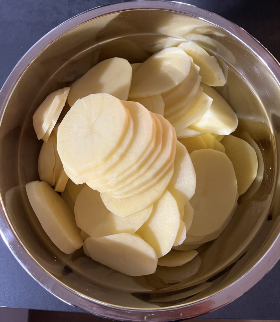 1. Kartoffeln schälen und in dünne, gleichmäßige Scheiben schneiden, damit sie später gleichmäßig garen. Die roten Zwiebeln schälen und in kleine Würfel schneiden. Die Hähnchenbrust in mundgerechte Würfel oder Streifen schneiden.