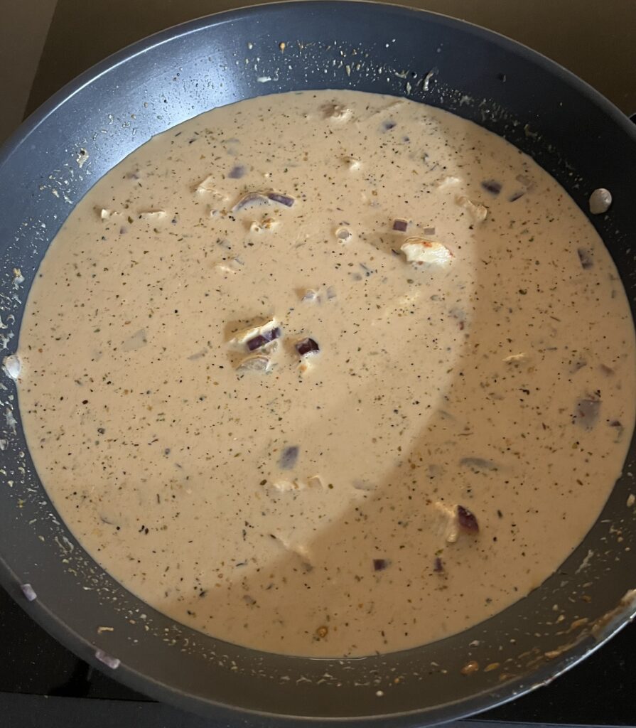 Das Tomatenmark in die Pfanne geben und kurz mit anrösten, damit es seine Süße entwickelt. Anschließend Milch und Sahne dazu gießen und alles gut verrühren. Die Soße einmal aufkochen lassen.