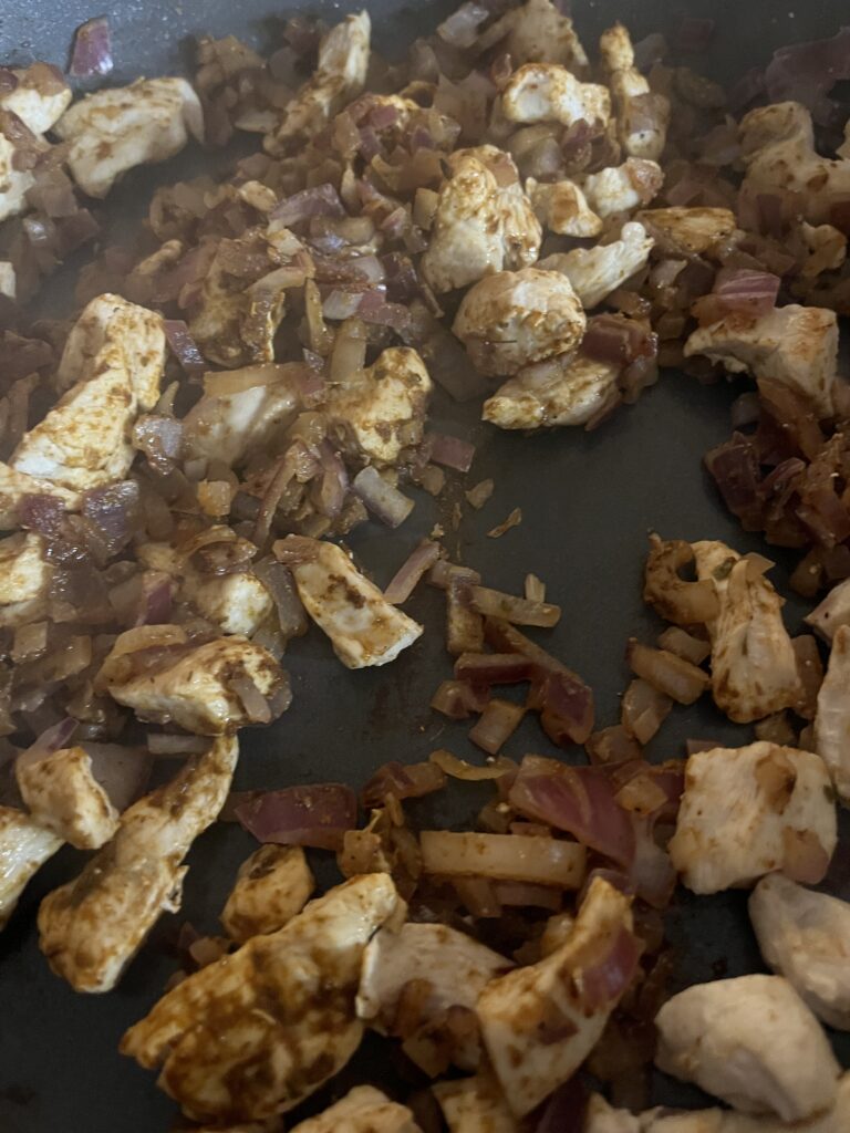 Eine große Pfanne mit etwas Öl erhitzen. Zuerst die Kartoffelscheiben und Zwiebelwürfel in die Pfanne geben und ein paar Minuten anbraten, bis sie leicht Farbe bekommen. Dann die Hähnchenstücke dazugeben und alles zusammen weiterbraten, bis das Hähnchen rundum angebraten ist. Mit Paprikapulver würzen und kurz mitrösten.