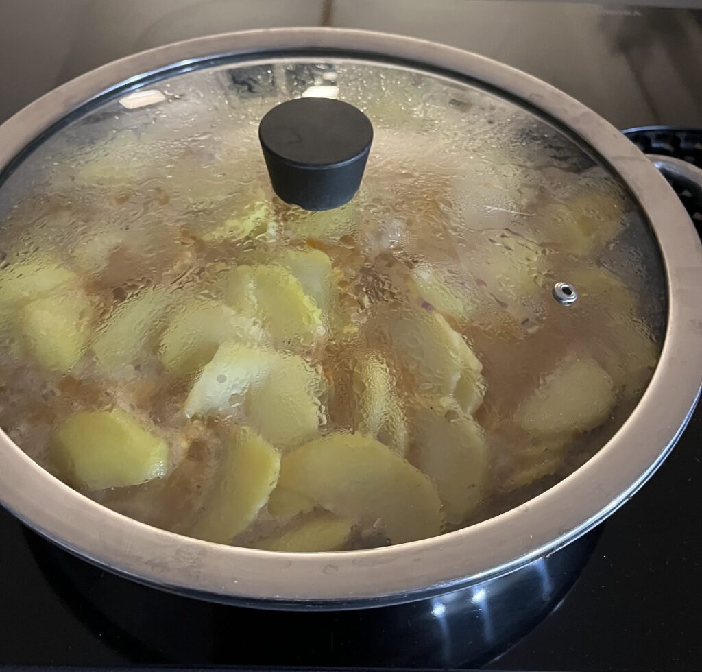 Die Hitze reduzieren, einen Deckel auf die Pfanne setzen und alles ca. 15 Minuten sanft köcheln lassen, bis die Kartoffeln fast gar sind. Zwischendurch gelegentlich umrühren, damit nichts am Boden anhängt.