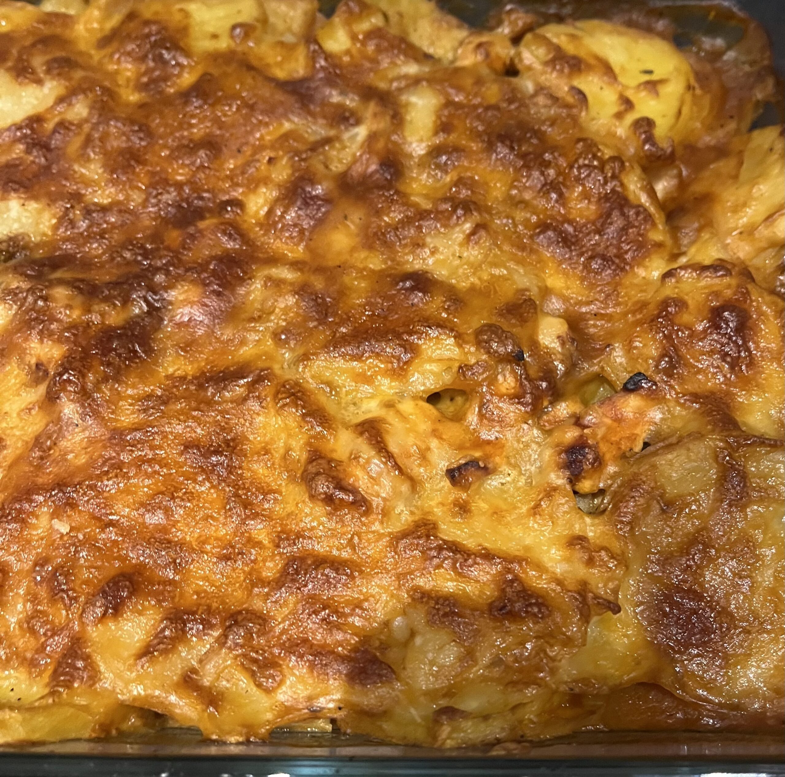 Dünn geschnittene Kartoffeln, angebratene Zwiebeln, zartes Hähnchen, eine schnelle Tomaten-Milch-Sahne-Soße und oben drauf eine Schicht geschmolzener Käse. Minimaler Aufwand, maximaler Comfort – perfekt für den Feierabend oder fürs Familienessen, wenn alle satt und glücklich sein sollen. 💛