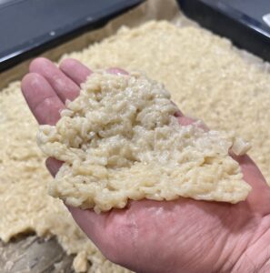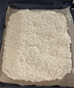 - Dann das Risotto auf ein mit Backpapier belegtes Blech streichen und komplett abkühlen lassen. (Wichtig, sonst wird’s beim Formen ein klebriges Chaos.)