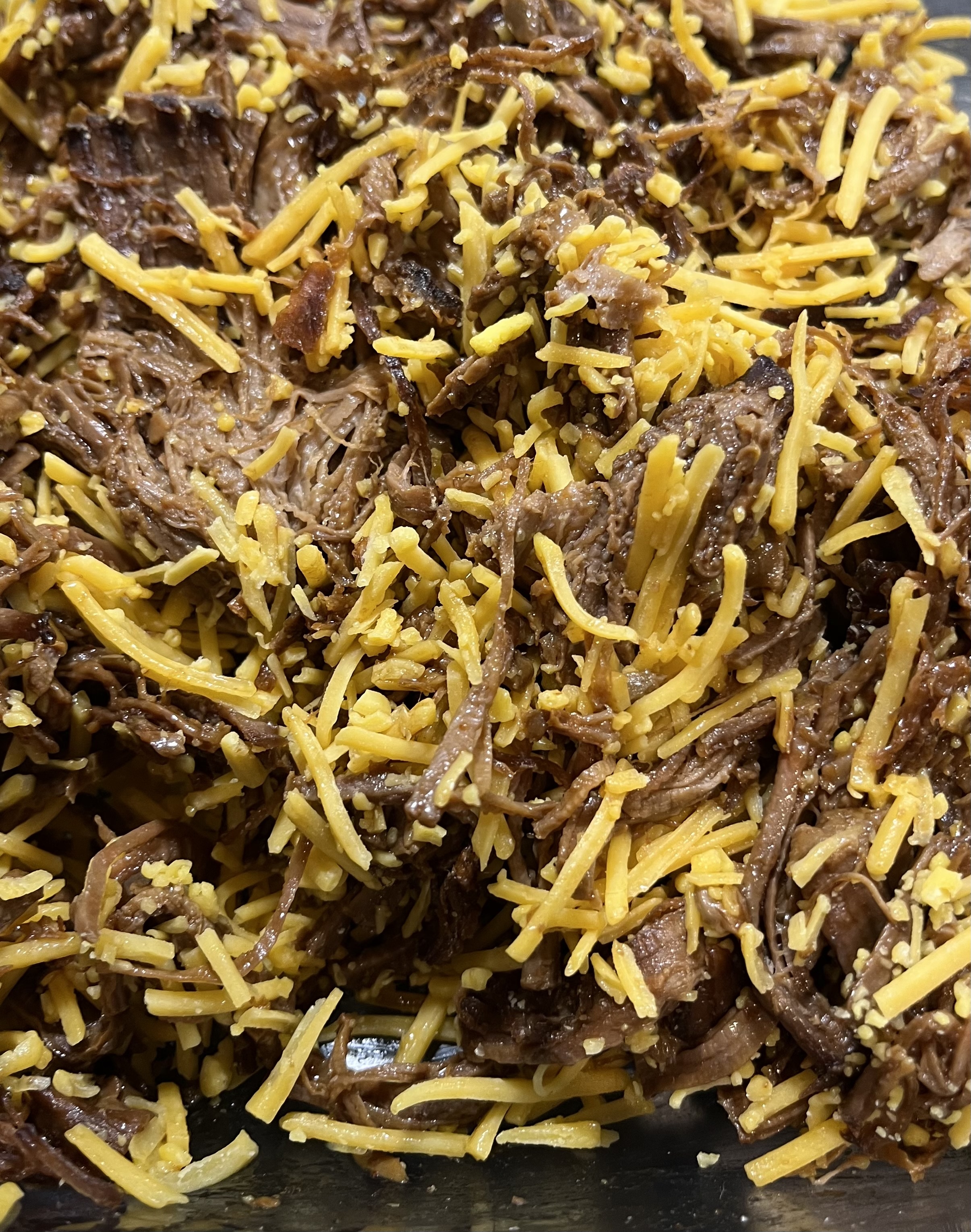 - Pulled Pork mit Cheddar vermengen.Wenn du’s gerne mit Kick magst: Chilischote fein hacken und mit rein.