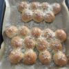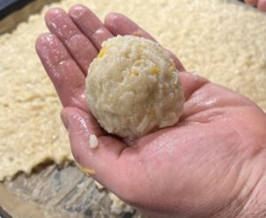 - Versuch eine Mulde zu formen und gebe die Füllung rein. Achtung: Nicht zu großzügig sein, sonst könnt Ihr die Kugel nicht schließen. Aber nach ein paar Kugeln habt Ihr den Dreh raus.