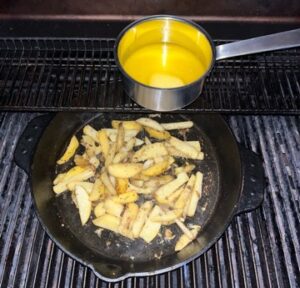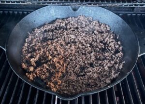 - Schneide das Rumpsteak in dünne Streifen und würze es mit Öl, Salz, Pfeffer oder einem Steakgewürz. Die Gusspfanne sollte schon auf dem Grill vorgeheizt sein. Füge dann Butterschmalz hinzu und brate das Rumpsteak scharf in der Gusspfanne an.Alternativ: Das Hackfleisch in die vorgeheizte Gusspfanne geben und scharf anbraten. Das Hackfleisch dann mit Salz & Pfeffer würzen.Wen alles gut angebraten ist, das Fleisch wieder aus der Pfanne holen.