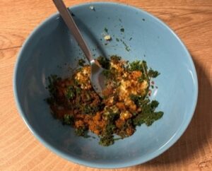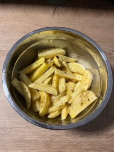 - Wasche die Kartoffeln, entferne unschöne Stellen und schneide die Kartoffeln in Spalten. Kartoffeln in eine Schüssel geben und nach belieben würzen. Ich habe Knoblauchöl, Black Garlic und Salzflocken verwendet. Ihr könnt aber auch Pommessalz oder ein Kartoffelgewürz verwenden.