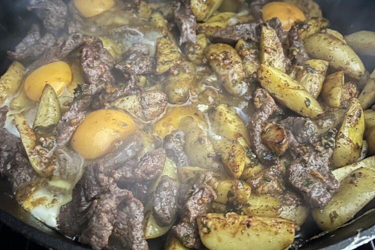 - Wenn die Kartoffeln Innen weich und außen kross sind, füge das Fleisch wieder hinzu und mische alles gut durch. Füge dann die 5 Eier direkt einzeln aus der Schale hinzu. Es soll als eine Art Spiegeleier zwischen der Kartoffel-Fleisch-Mischung entstehen.
