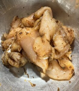 - Hähnchenbrust längs in der Mitte durchschneiden, leicht platt klopfen und dann mit Salz, Pfeffer, Paprikapulver und Hühnerbrühe-Pulver würzen. Kurz ziehen lassen, während du den Rest machst.