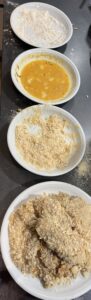 - Drei Teller bereitstellen:– Mehl– Eier verquirlt + gewürzt (Pfeffer, Paprikapulver)– Paniermehl (am besten gemischt mit etwas Panko)Hähnchen erst in Mehl, dann in die Eiermischung, dann in die Panade drücken. Schön fest andrücken, damit’s richtig knusprig wird.