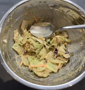 - Dann einen Teil der Soße mit dem vorbereiteten Salat mischen, bis alles schön cremig ist.