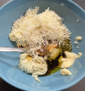 - Mayonnaise, Senf, Sojasauce, Pfeffer und Zitronensaft verrühren. Parmesan unterheben und gut vermengen.