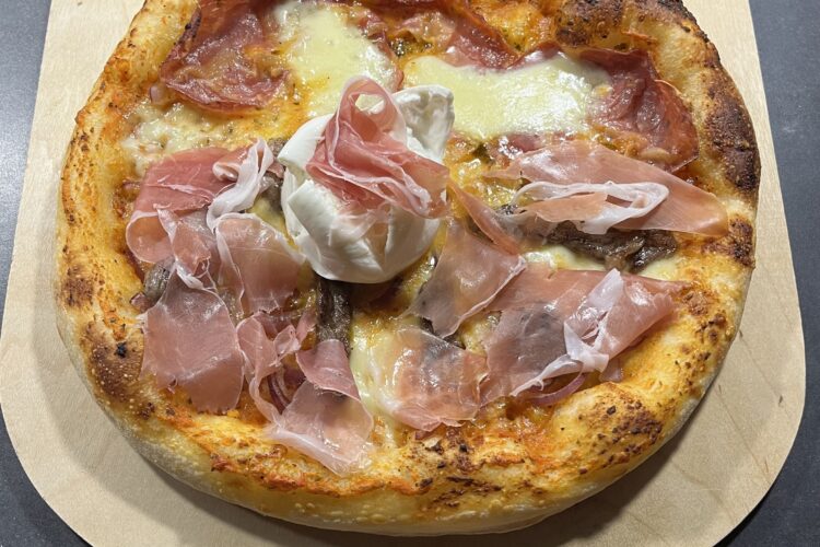 Dein Pizzateig ist jetzt startklar! Ob klassisch mit Tomatensoße und Fior di Latte, weiß mit Ricotta und Spinat oder extravagant mit Feigen und Prosciutto – alles ist erlaubt. Mit viel Selbstvertrauen den Teig auf eine Schaufel ziehen und bis zur gewünschten bräune des Teiges bzw. des Käses im Backofen, Grill oder Pizzaofen backen.