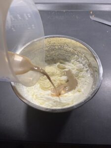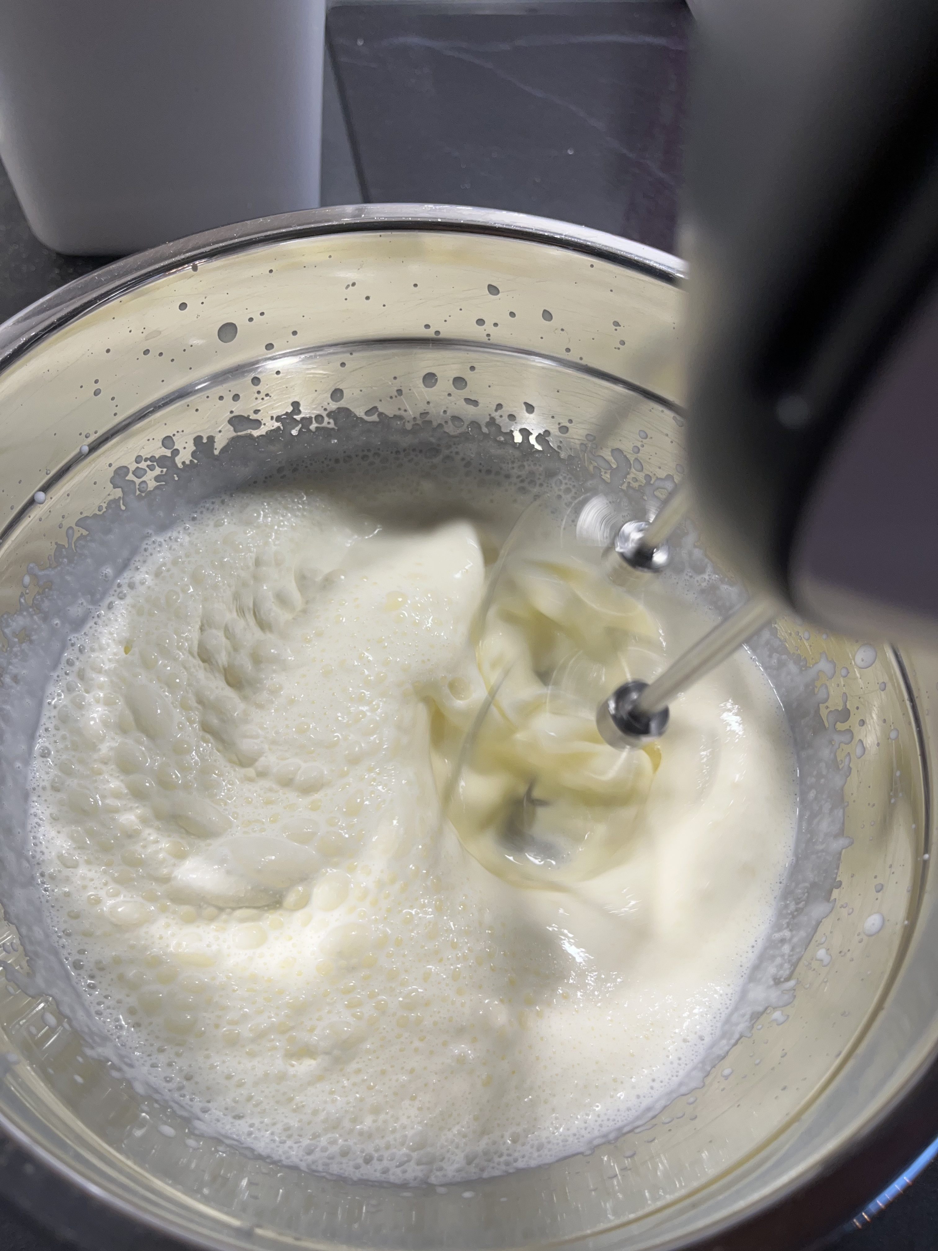- Die eiskalte Sahne in die kalte Schüssel gießen und mit dem Handmixer oder der Küchenmaschine aufschlagen, bis sie schön steif ist. Achte darauf, nicht zu lange zu schlagen, sonst wird sie schnell butterig – wir wollen eine fluffige Mousse, keine Brotaufstrich-Session. 😉