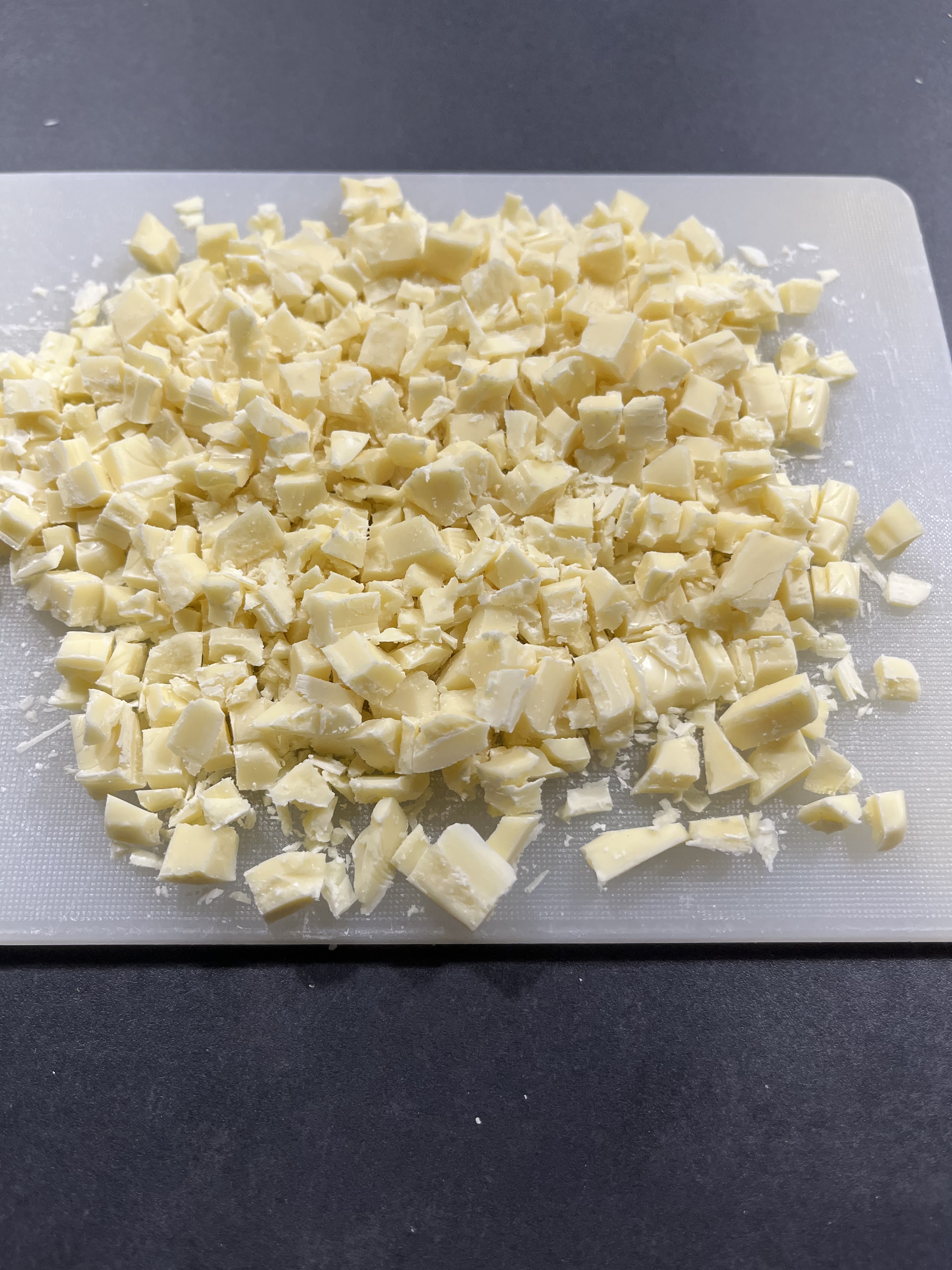 - Die weiße Schokolade grob hacken und entweder im Wasserbad oder vorsichtig in der Mikrowelle schmelzen. Je kleiner die Stücke beste besser schmilzt die Schokolade gleichmäßig. Zwischendurch immer wieder umrühren, damit nichts anbrennt. Wenn alles geschmolzen ist, die Schokolade kurz abkühlen lassen, sie soll flüssig, aber nicht mehr heiß sein.